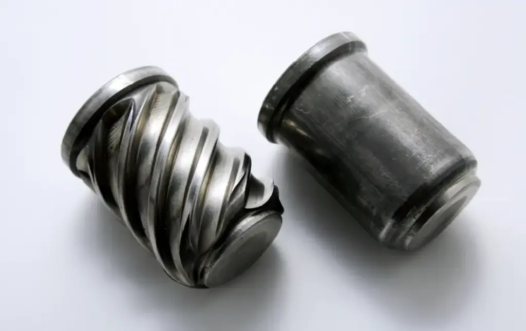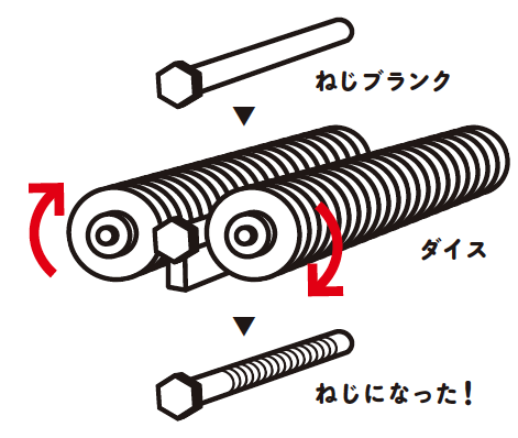 ねじブランクをダイスではさみ、ダイスの移動・回転によって、 ねじ山形状をねじブランクに転写する塑性加工方法のことです。 切削加工のように素材を削らず、圧縮させるので強度が増し、 表面も美しく精密な仕上がりになります。