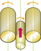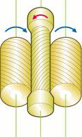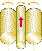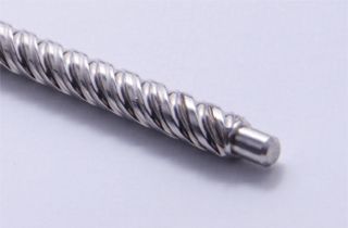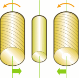 ねじブランクをダイスではさみ、ダイスの移動・回転によって、ねじ山形状をねじブランクに転写する塑性加工方法のことです。切削加工のように素材を削らず、圧縮させるので強度が増し、表面も美しく精密な仕上がりになります。