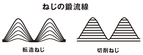 切削加工のように金属組織が切断されません。むしろ、塑性変形によって塑性加工効果が生まれ高い強度を得ることができます。